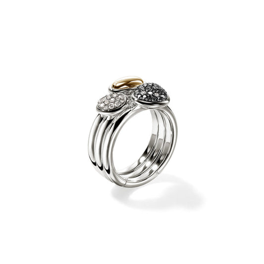 Pebble Stacking Rings, Sterling Silver, Gold, Black Sand Diamond Pavé