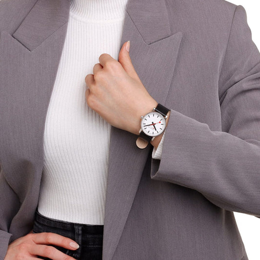 CLASSIC BRUSHED STEEL - WHITE DIAL - BLACK VEGAN GRAPE LEATHER - 36 MM