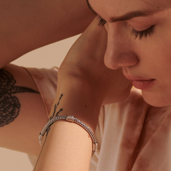 Woven by hand in reclaimed sterling silver, our heritage Icon Chain is the foundational expression of John Hardy artisanship. This one features ethically sourced diamond stations.