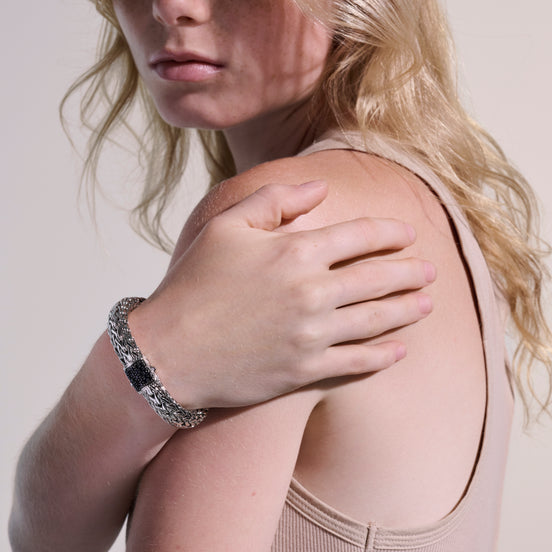 Woven by hand in reclaimed sterling silver, our heritage Icon Chain is the foundational expression of John Hardy artisanship. This one features an ethically sourced black sapphire clasp.