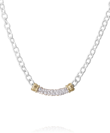 Pavé on point: Dazzling diamonds shine brightly on our elegant necklace. Featuring a simple yet sophisticated bar design, it's crafted in 14K gold and sterling silver. Pairs perfectly with day or evening looks as a glamorous finishing touch.