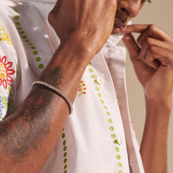 An artisanal hand-cut beaded bracelet in reclaimed sterling silver.